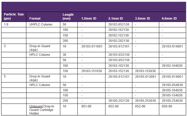 Dostupné rozměry kolon Hypersil GOLD AX: