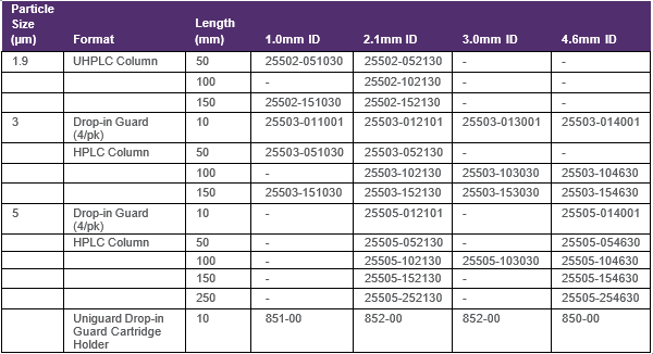 Dostupné rozměry kolon Hypersil GOLD C4: