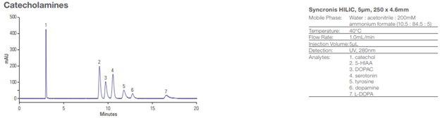 Obr. 1 Analýza catecholaminů na koloně Syncronis HILIC