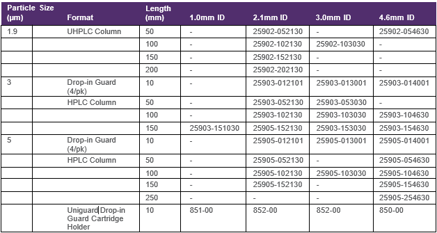 Dostupné rozměry kolon Hypersil GOLD Phenyl:
