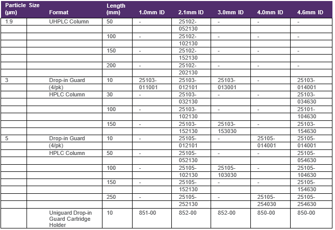 Dostupné rozměry kolon Hypersil GOLD Silica: