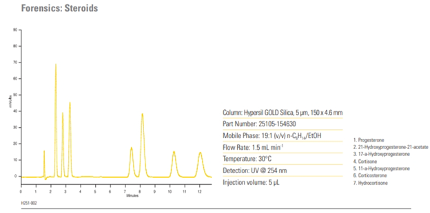 Obr. 1 Analýza steroidů na koloně Hypersil GOLD Silica
