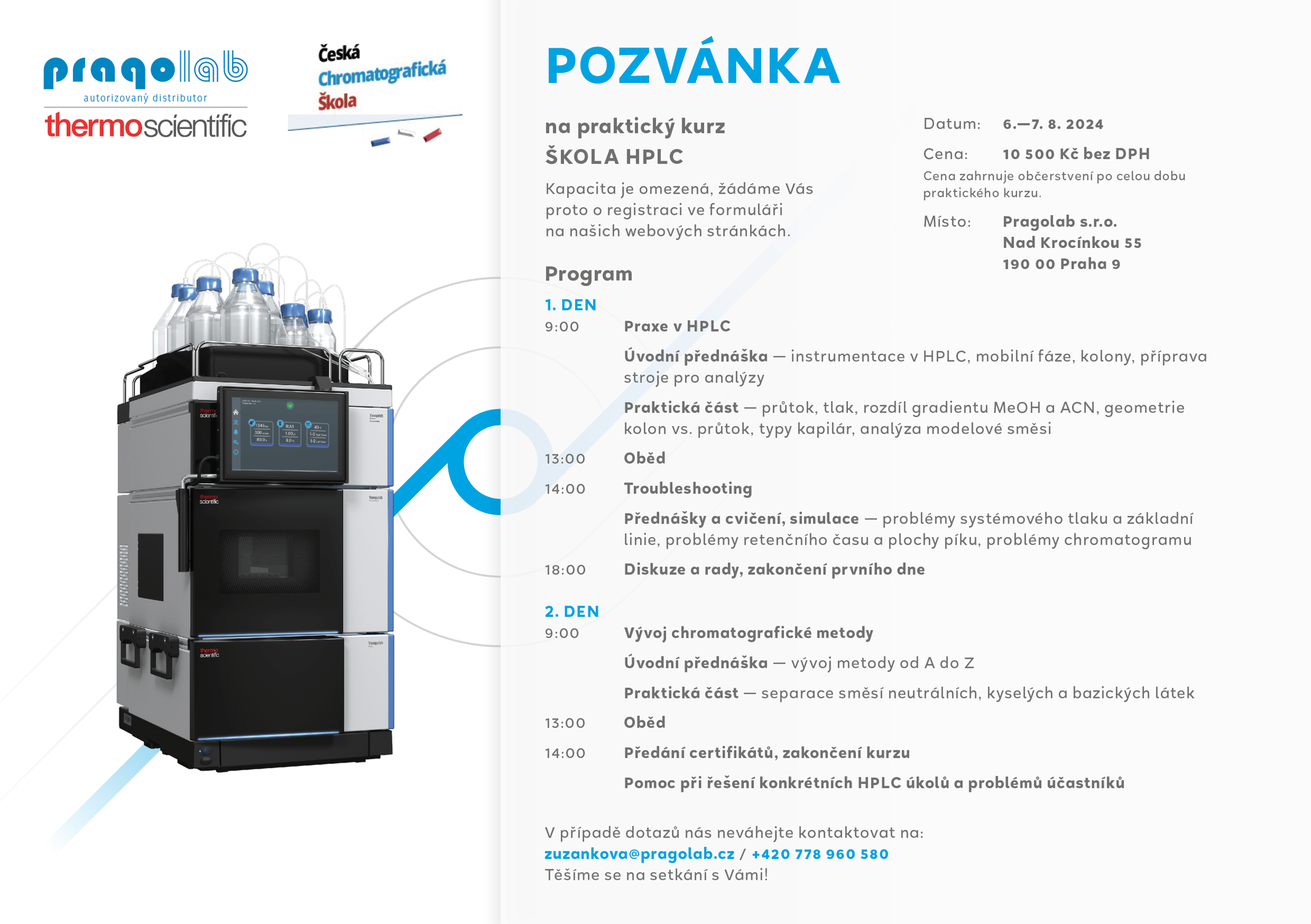 praktický kurz – ŠKOLA HPLC, který pořádáme ve spolupráci s Českou chromatografickou školou v čele s předními lektory (a autory publikací Moderní HPLC separace v teorii a praxi I. a II. díl)