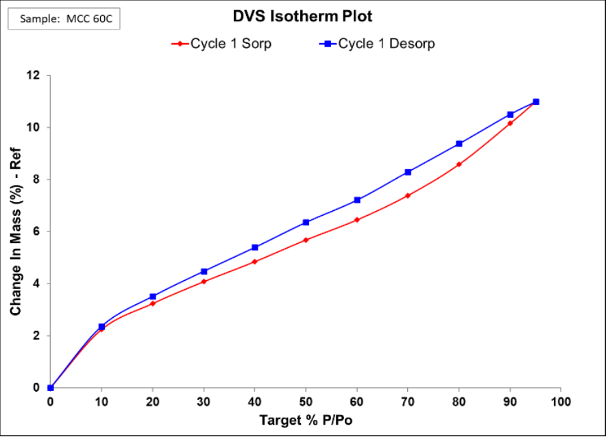 Pro lepší účinnost orální dávkové formy farmaceutických léčiv a vývoj zpracování je zásadní pochopení fyzikálních vlastností aktivních a pomocných látek, jako je mikrokrystalická celulóza (MCC). MCC je široce používána ve farmaceutickém průmyslu jako pomocná látka v kombinaci s aktivními farmaceutickými přísadami. MCC je prášek prakticky nerozpustný ve vodě, ale vodu absorbuje, je značně hygroskopický. Uvádí se, že sorpce vlhkosti pomocí MCC způsobuje problémy se stabilitou tablet, což ovlivňuje jejich účinnost v důsledku vystavení vlhkosti [1, 2]. Tato studie byla provedena za účelem měření sorpčního chování vody a kinetiky MCC (standardní materiál PH-101) v rozsahu 0–95 % relativní vlhkosti při teplotě 5–60 °C pomocí dynamické sorpce par (DVS). Difúzní koeficienty byly vypočítány v teplotním rozmezí 10–60 °C.